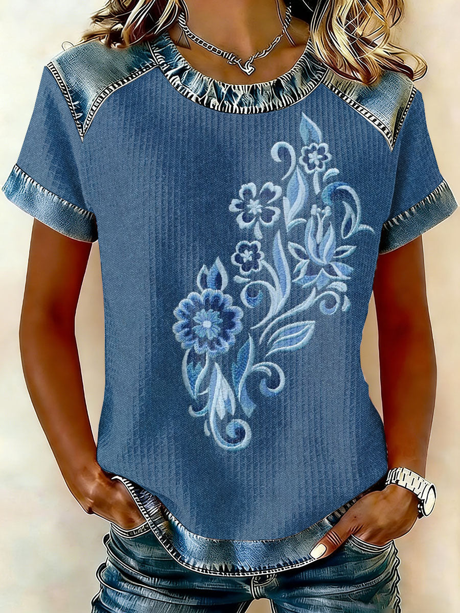 Damska koszulka z krótkim rękawem w stylu vintage z motywem patchworku
