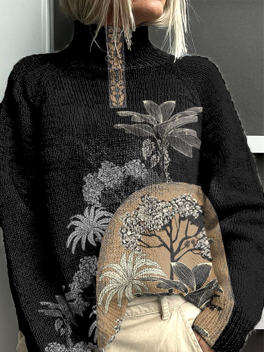 Damski czarny tradycyjny sweter z golfem w kwiatowy wzór