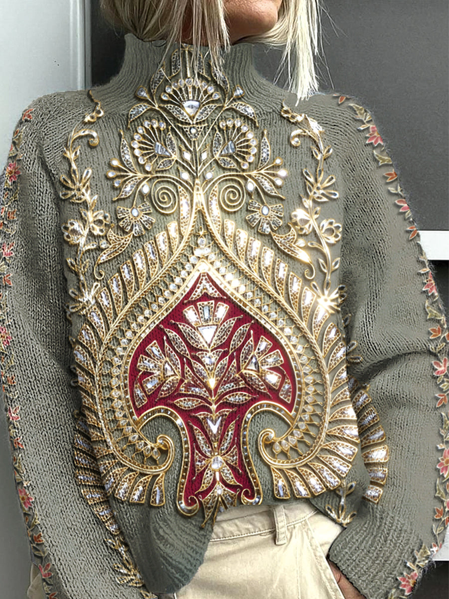Damski diamentowy kwiatowy nadruk zielony swobodny sweter z golfem