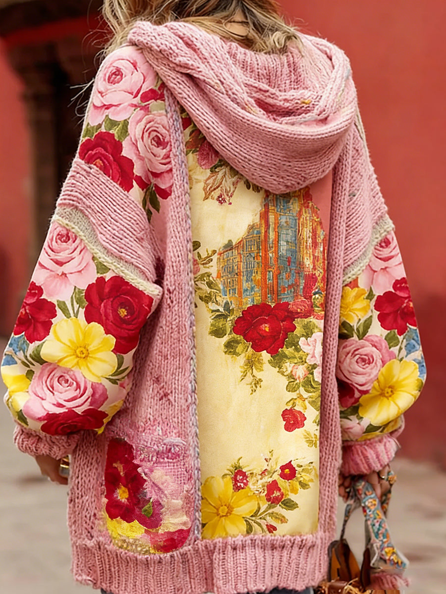 Damski styl vintage świadomość raka piersi z motywem kwiatowy wzór na guziki wygodny sweter z kapturem