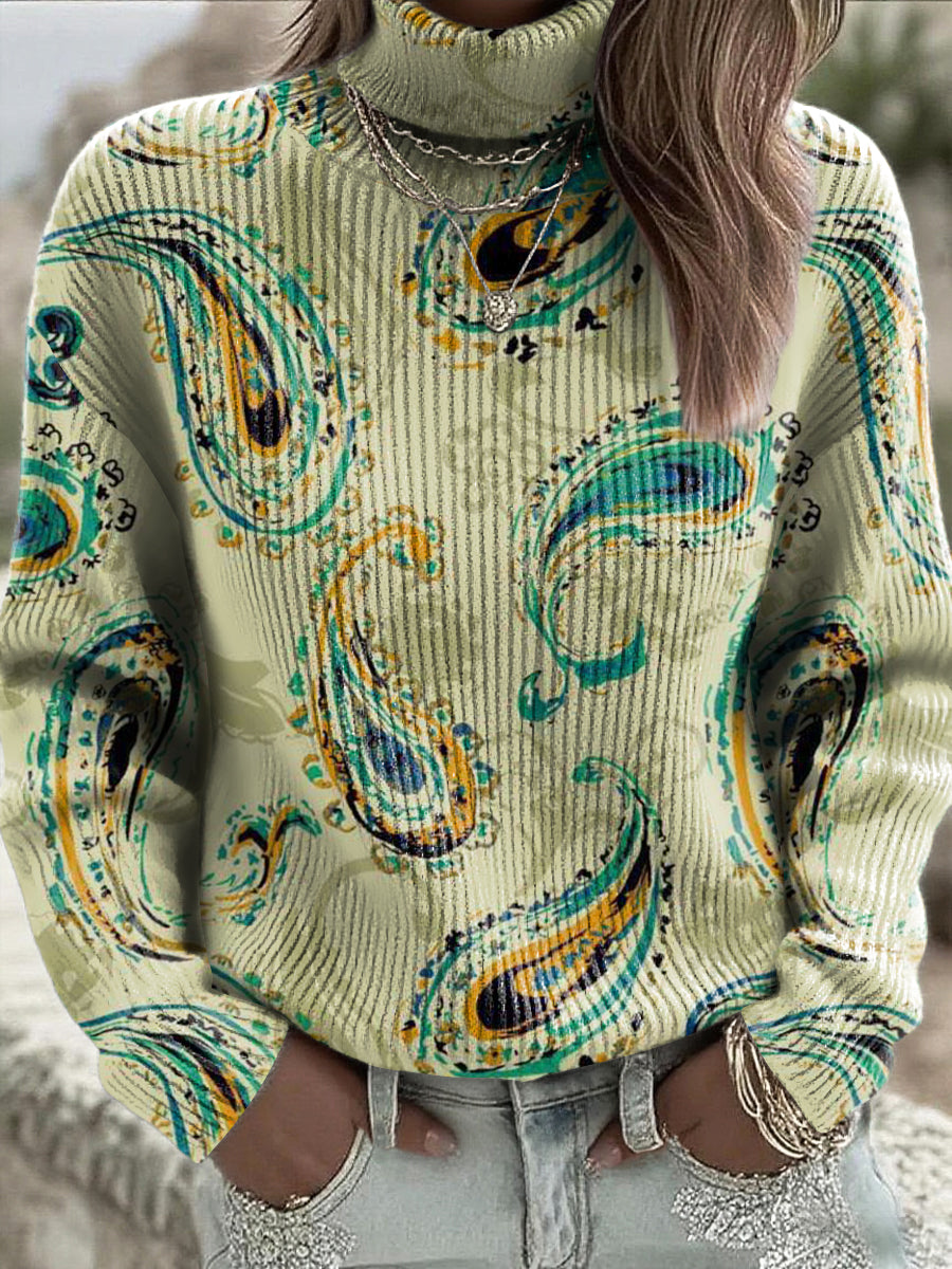 Damskie Pawie Pióro Paw Nadruk Zielony Sweter z golfem