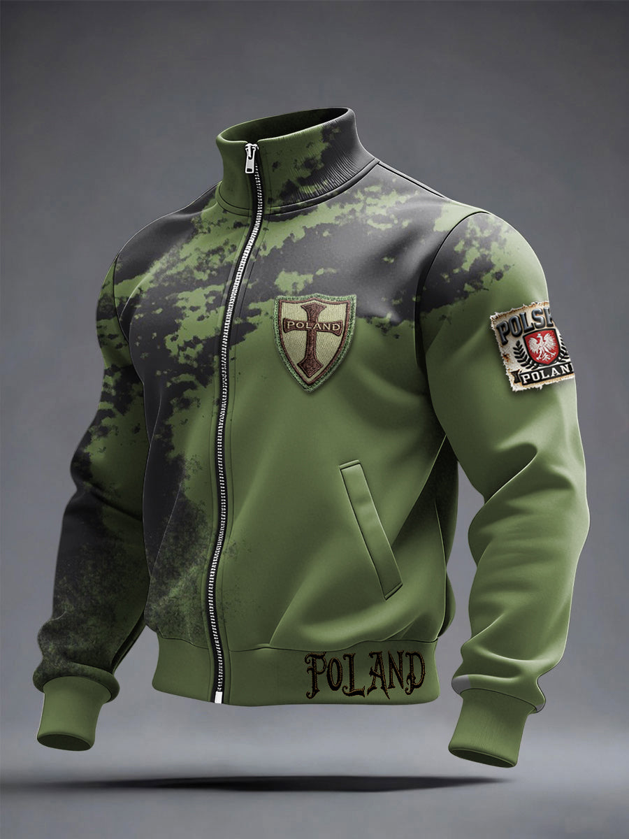 Męska kurtka z zielonym zamkiem z nadrukiem z polskim krzyżem